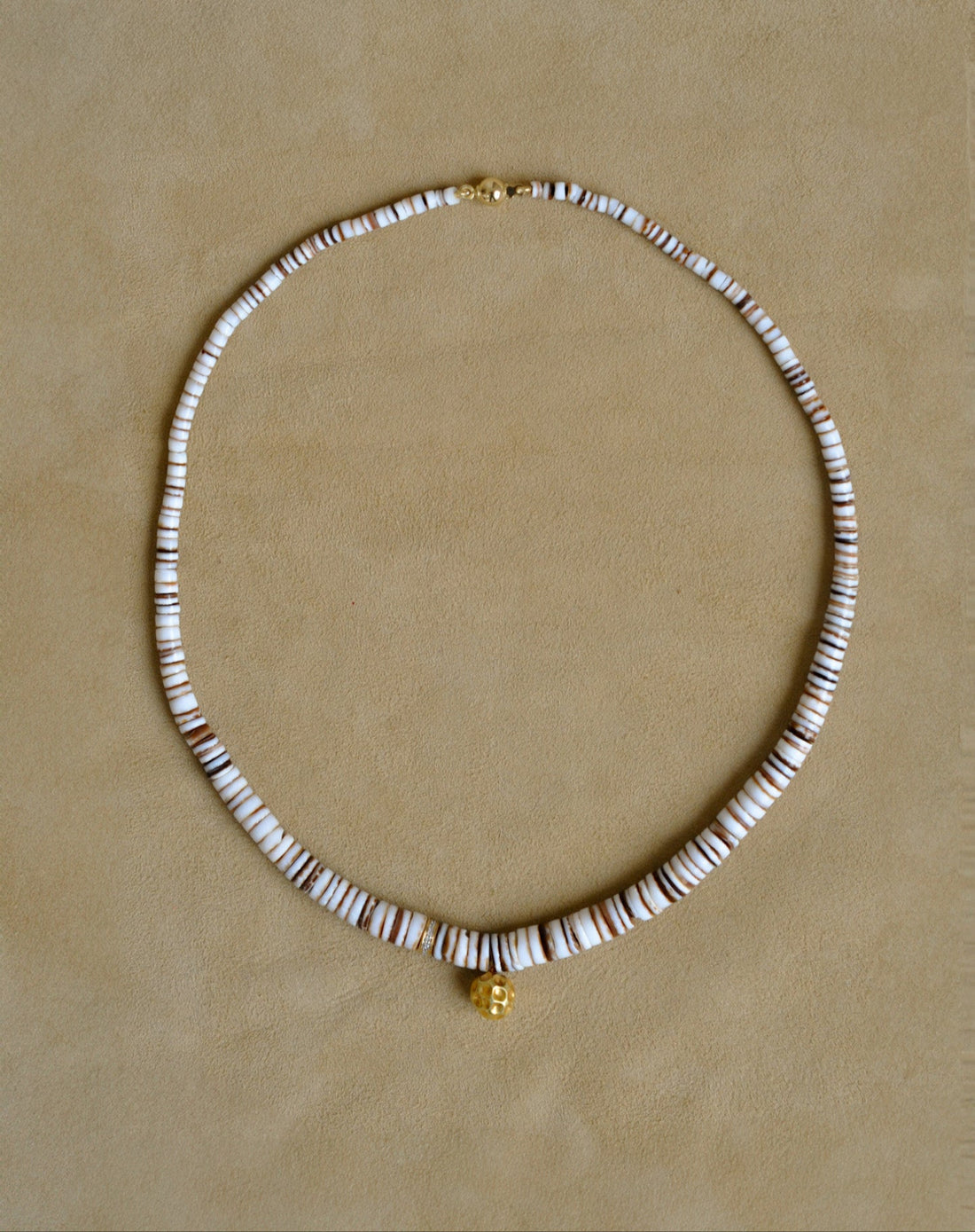 Striped black olive shell beads, paired with an 18k gold boule and a single diamond bead.